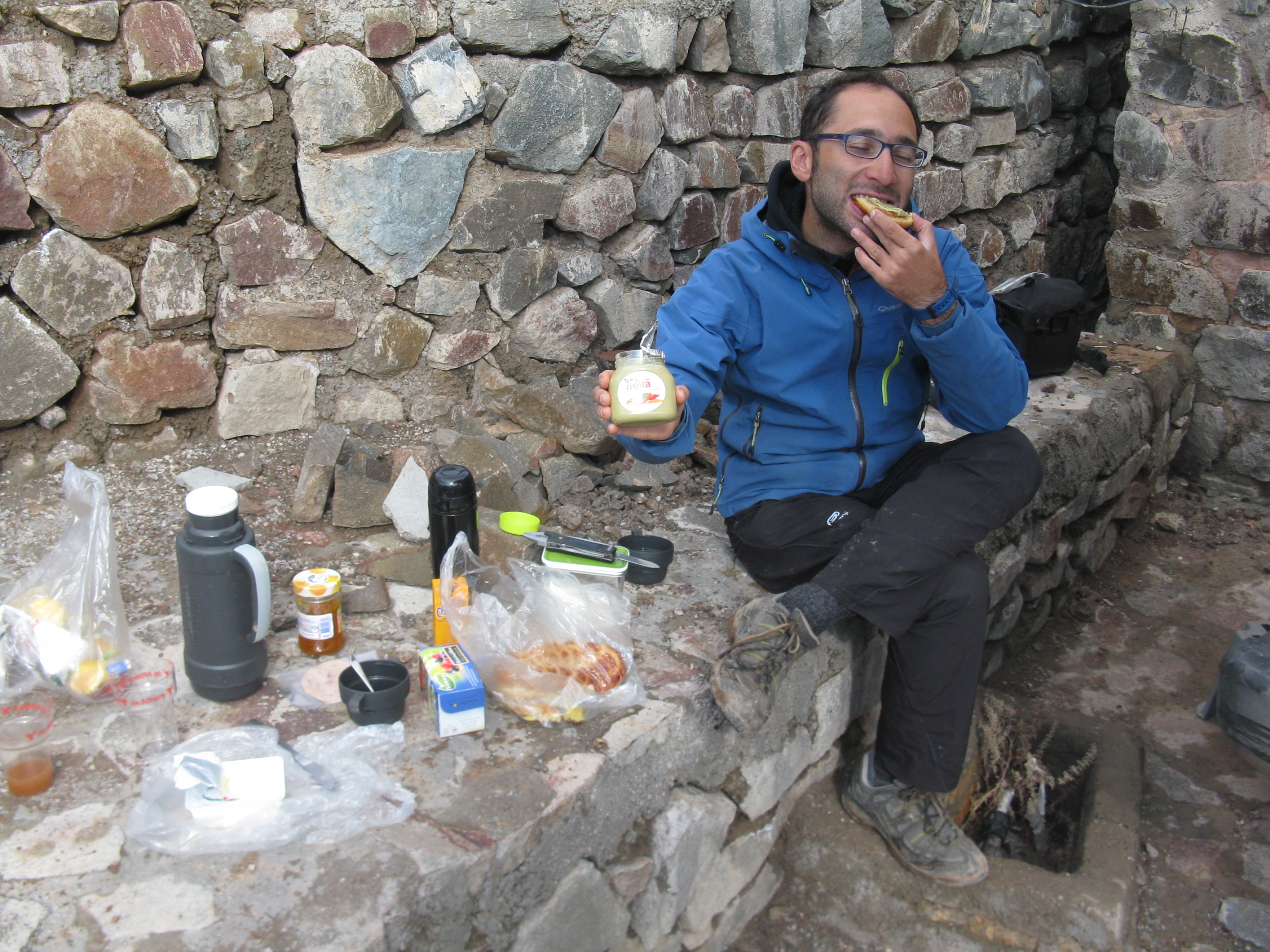 Kerem laat zijn fiets achter in Qazvin (dat kan hier gewoon. Iraniërs zouden je fiets 40 kilometer verderop na komen brengen als het nodig is) en stapt nu bij mij in de auto. We zijn ongeveer een week samen onderweg. We rijden twee dagen over kriskrossende wegen op weet ik wat voor hoogte, kamperen in de bergen, op plekken waar het toevallig net vlak is, koken en eten in de kou en de regen, bezoeken Alamut en Lamiasar Castle in de mist en eindigen in Karaj, onder de rook van Teheran, op een tapijtje op de grond in het huis van Khosrow en Nargiss.