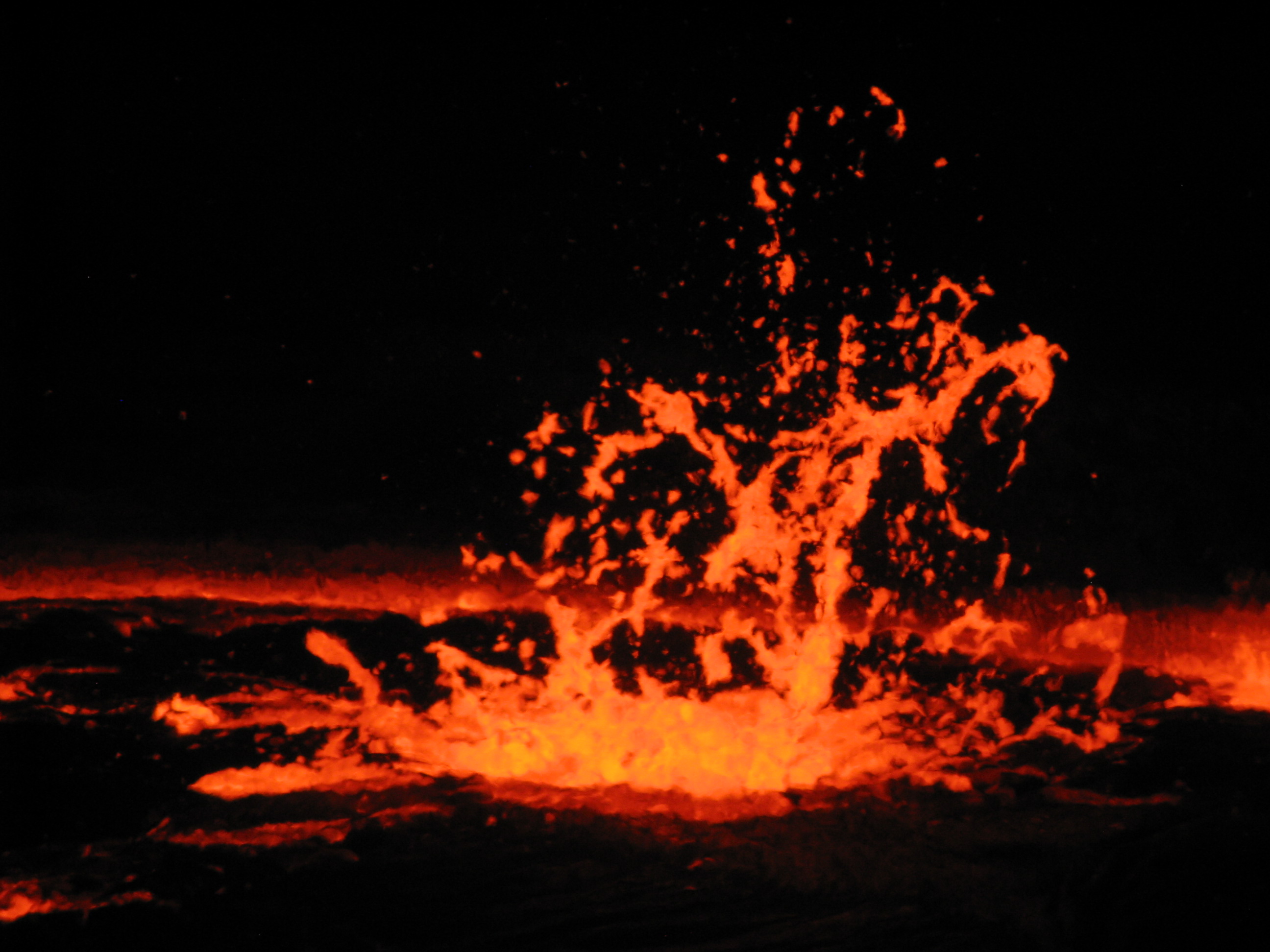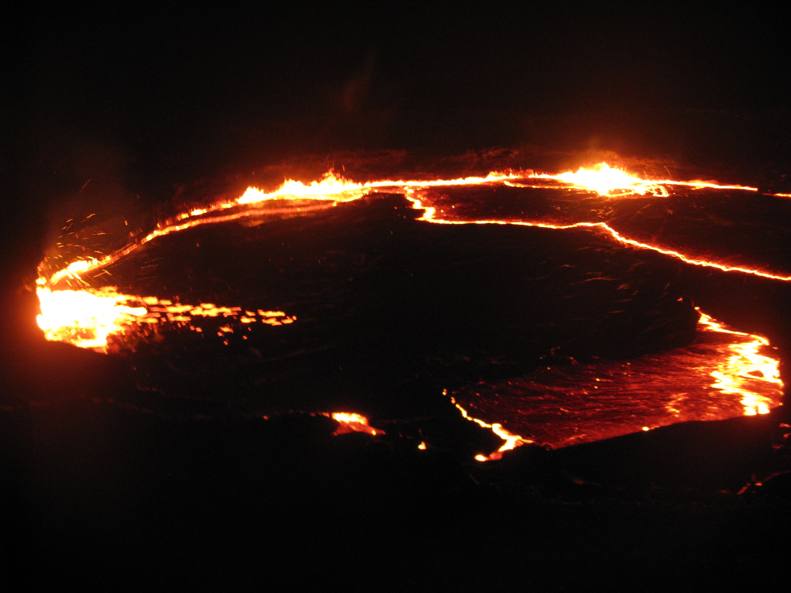 De waas komt steeds dichterbij en na een korte afdaling staan we toch nog plotseling oog in oog met dat waarvoor we gekomen zijn; kokende aarde. We kijken naar een borrelend, sissend, klotsend lavameer, een zwarte laag vloeibaar gesteente die stroperig tegen de afgebrokkelde rotsrand klotst als het afgekoelde velletje aan de oppervlakte van een glas warme chocomel. Van onder snijdt een fel oranje mes van vuur figuren uit in de taaie smurrie. Op onverwachte plekken kan het zwarte vel het geweld onder zich niet meer houden en braakt de lichtgevende diepte een vuurwerk uit dat een furieuze hitte in ons gezicht slaat en ons onwillekeurig achteruit doet deinzen. Alsof de zon zelf ons waarschuwt afstand te houden. Iedereen is stil. Dit zagen we niet aankomen.
