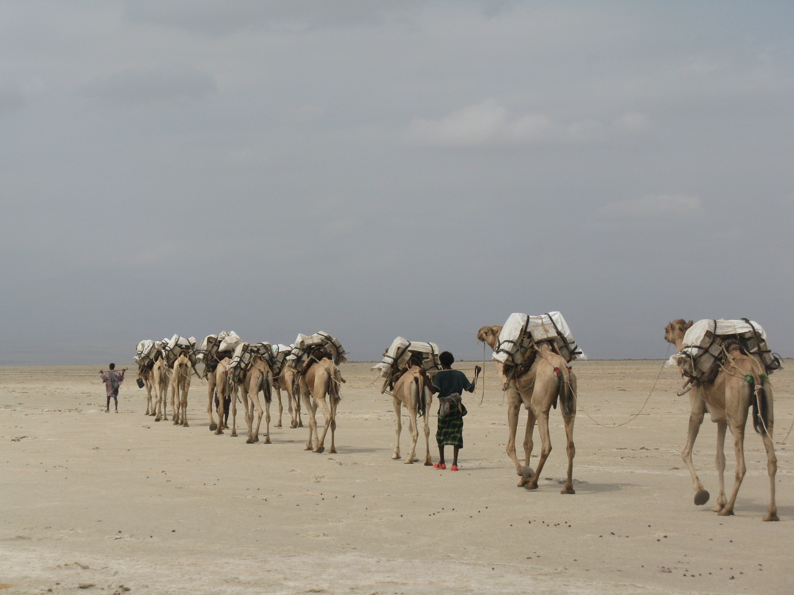 Het toetje van de tour komt met zout. Voor we terugkeren naar Mekele rijden we naar een zoutmeer waar de lokale bevolking blokken van 20 kilo uit de grond hakt. Een oneindige voorraad strekt zich uit tot aan de horizon. Aan de rand van het werkgebied staan en liggen de kamelen en ezels klaar om de blokken af te voeren. We zagen ze al eerder; de lange zoutkaravanen, traag en statig sjokkend richting de verte. Dat kan ook anders: vervoer met vrachtwagens, de zoutwinning met machines, maar de bevolking kiest ervoor de traditie in stand te houden. En dat is natuurlijk precies waarom wij hier zijn en foto’s staan te maken.