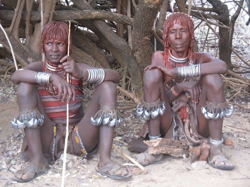 De verzamelplek is een rivierbedding zonder water. Onder de lage bomen zitten de meisjes te wachten, roodbruin in hun rokken van dierenhuid, de schouders en gevlochten haren ingesmeerd met okerkleurige boter. Metalen banden om hun polsen en hals, bellen onder hun knieën gebonden. Hun shirt is aan de achterkant opgerold tot aan de nek, aan de voorkant tot aan de borsten. Vóór hen, in de zon, zitten de toeristen, op de hurken, klikkende camera’s. De meisjes laten het toe, zijn het gewend, denken misschien aan het geld dat ze straks in de hand geduwd krijgen. Dat hoop je tenminste, dat niet de gidsen alles opstrijken. Je pakt je camera, hurkt, klikt. Je voelt je een voyeur, maar je doet het toch. Jan filmt, slungelt zich in bochten om de toeristen uit beeld te houden.