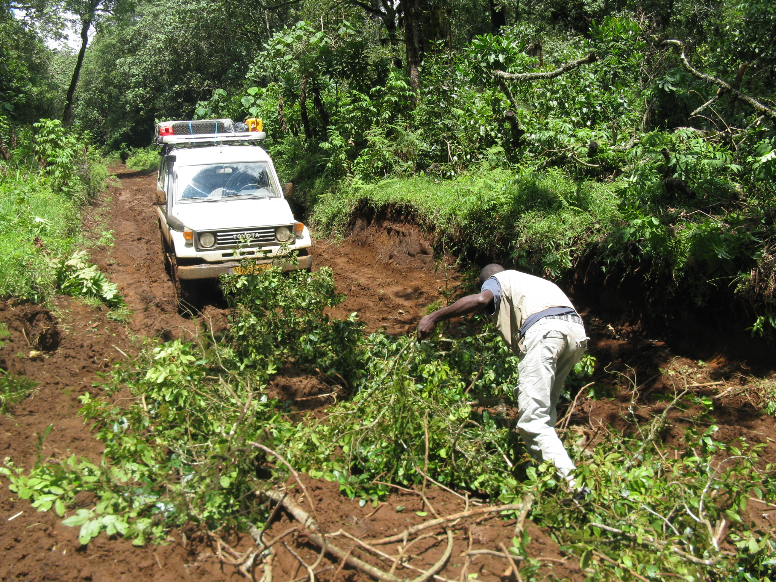 Opnieuw kapten de Kenianen het halve regenwoud om Landcruiser grip te geven, groeven met de panga de modder weg, duwden terwijl ik gas gaf. Het ging niet voor- en niet achteruit.