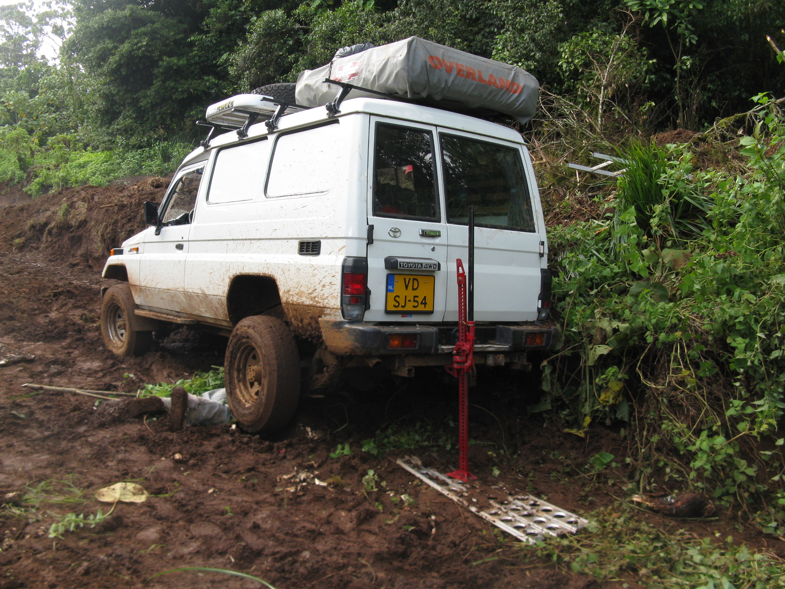 Ik haalde de auto overhoop om mijn hi-jack boven water te krijgen. Gezamenlijk krikten we de achterkant van Landcruiser omhoog, stopten de andere helft van het regenwoud onder de wielen. Het baatte niet.