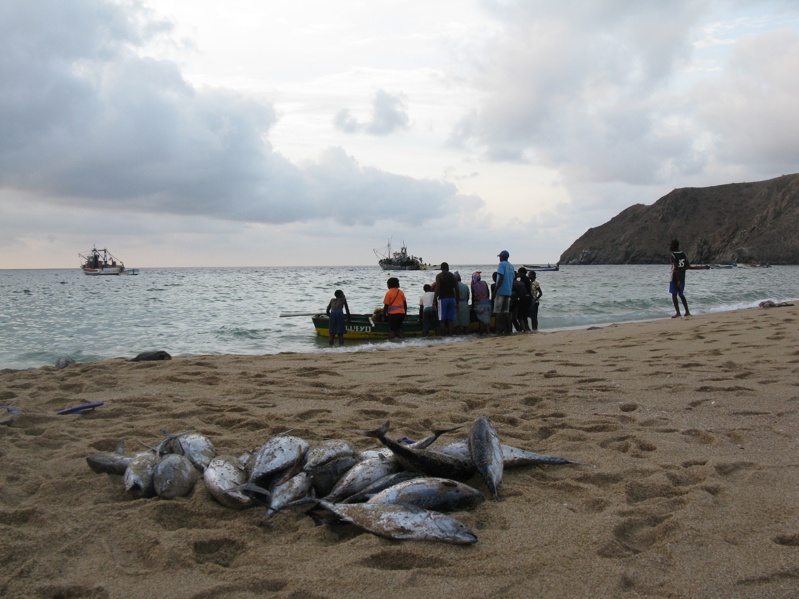 In plaats van te eten observeerde ik wat men zoal doet in een gemiddeld vissersdorp: vis aan land brengen. Twee bootjes meerden aan en werden door een man/vrouw of tien deels het strand op getrokken. Manden vol vis kwamen tevoorschijn, die werden omgekieperd op het zand. De vis werd gesorteerd en geteld. Hier en daar liep iemand die er blijkbaar recht op had weg met een mooie buit, waarna enkele meiden het gros van de vangst in een plastic bak gooiden, die op het hoofd tilden en koers zetten naar de hutjes verderop, waar, zo vermoed ik, de markt was. Dit was een dagelijks ritueel, dat kon ik zien. De volkomen vanzelfsprekende manier waarop het ging, waarbij eenieder van iedereen wist waarom die daar was. Er was soms discussie, een vriendelijk soort onenigheid, maar geen ruzie. Er werden grapjes gemaakt, geld wisselde van hand. Hier was een dorp in alle rust bezig voor zichzelf te zorgen, met alle sociale relaties die daarbij hoorden. Er was een ingesleten structuur en organisatie die ik zag, zonder dat ik haar doorgrondde. Het waren de lijntjes die een dorp bij elkaar houden, maar voor een buitenstaander onzichtbaar zijn. Ik stond ernaar te kijken, een blanke met een camera, en eindelijk kon het een keer niemand wat schelen.