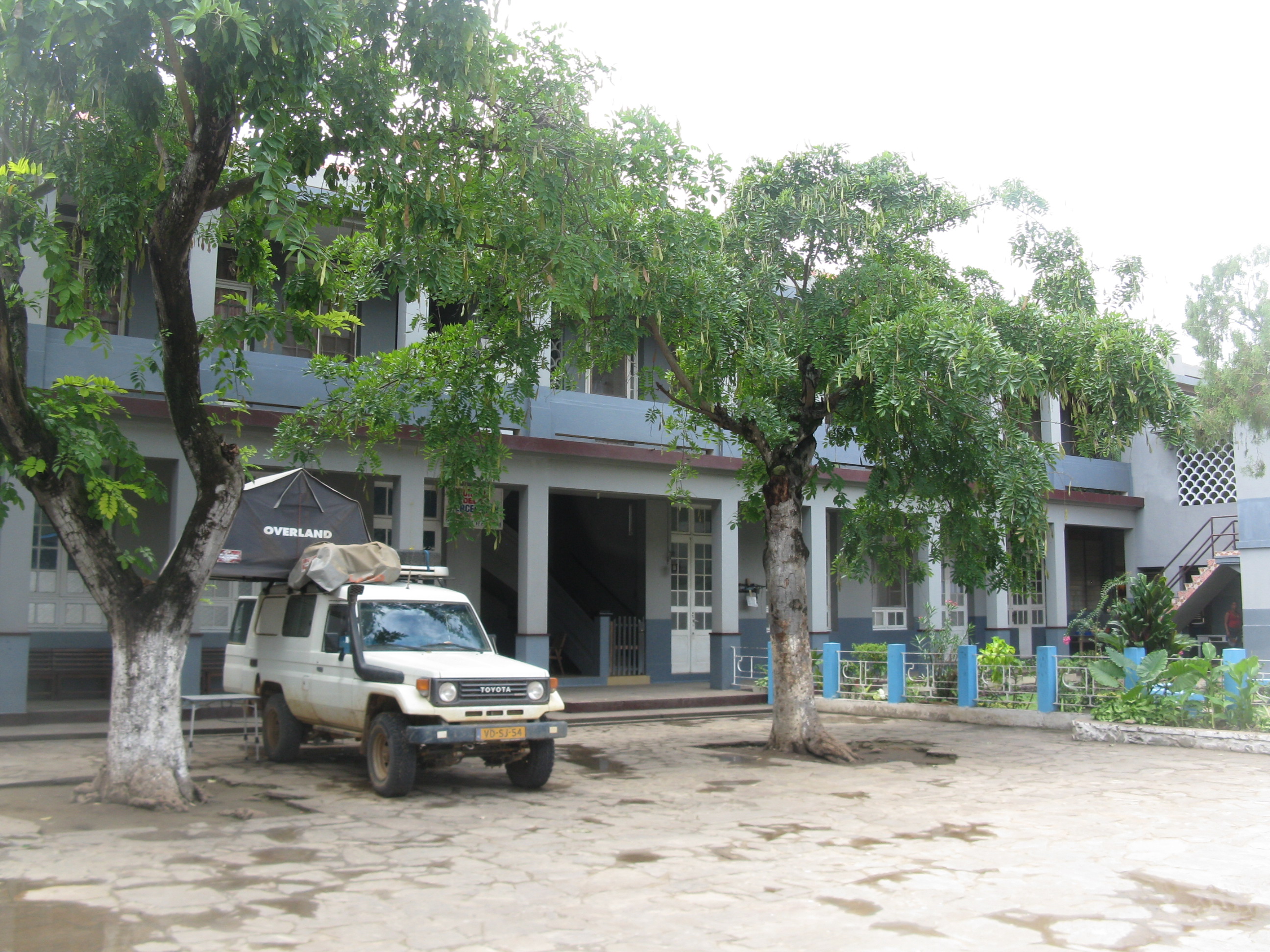 Zoals gebruikelijk bij zo’n beetje alle missieposten is ook aan deze een school en een ziekenhuis verbonden. Er is een door een galerij omzoomde binnenplaats die dienst doet als schoolplein, waar ik onder twee bomen mag kamperen. Het is weekend dus er zijn geen kinderen en er heerst een vredige rust. Een van de zusters sjouwt met een emmer water, de huismeester veegt wat afgevallen blaadjes weg, vier verse vissen liggen op een schaal te drogen in de zon. Waar heb ik mij eigenlijk druk om zitten maken? Als ik hier nog ergens stroom vandaan weet te halen is dit een perfecte plek om twee dagen in de koelte van de galerij te gaan zitten schrijven. Ik moet niet teveel willen forceren, Afrika laat dat niet toe, zoveel heb ik inmiddels toch wel geleerd? Ik haal de stroomkabel uit de auto en ga op zoek naar een stopcontact.