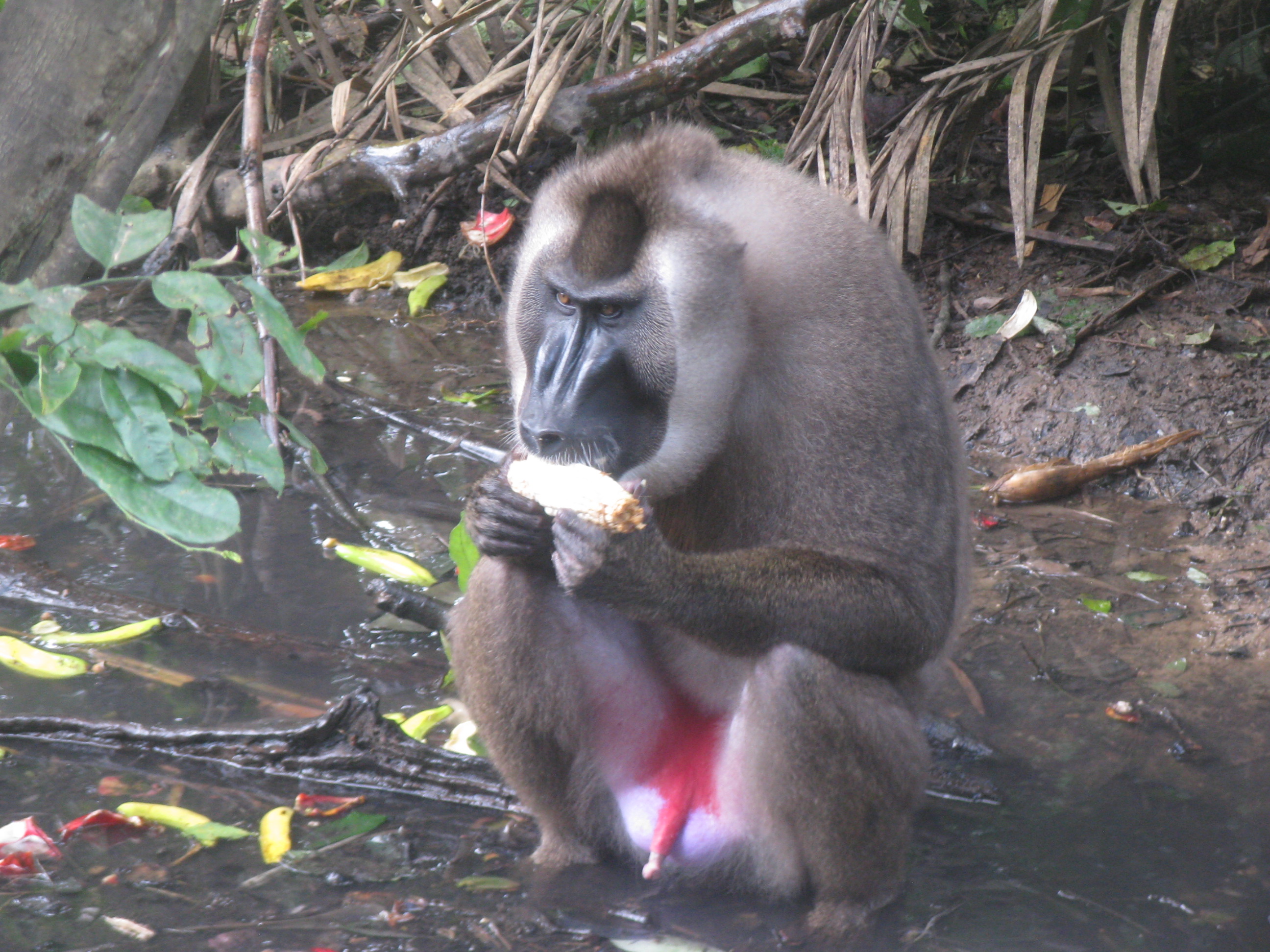 Het was een prachtige plek, midden in het bos, gerund door vrijwilligers. De apen zaten in grote omheinde stukken oerwoud, waar ze deels zelf hun voedsel konden vinden. Op gezette tijden werden ze ook gevoerd, wat, gezien de omvang van de omheiningen, voor sommige groepen het enige moment was dat je ze kon zien – de rest van de tijd verdwenen ze in het bos. Bij de mandrils werden de bananen en de maïs per kruiwagen naar binnen gereden, wat een oorverdovende chaos teweegbracht waarbij alle apen tegelijkertijd op het voedsel af stormden om even later uit de kluwen tevoorschijn te komen met zoveel bananen als ze konden dragen. Vervolgens was het zaak zo snel mogelijk het struikgewas of een boom in te schieten om te voorkomen dat ze door hun vrienden werden beroofd. Pas toen iedereen zijn kostje naar tevredenheid bij elkaar had gegraaid en een plekje had gevonden om te schrokken keerde de rust terug.