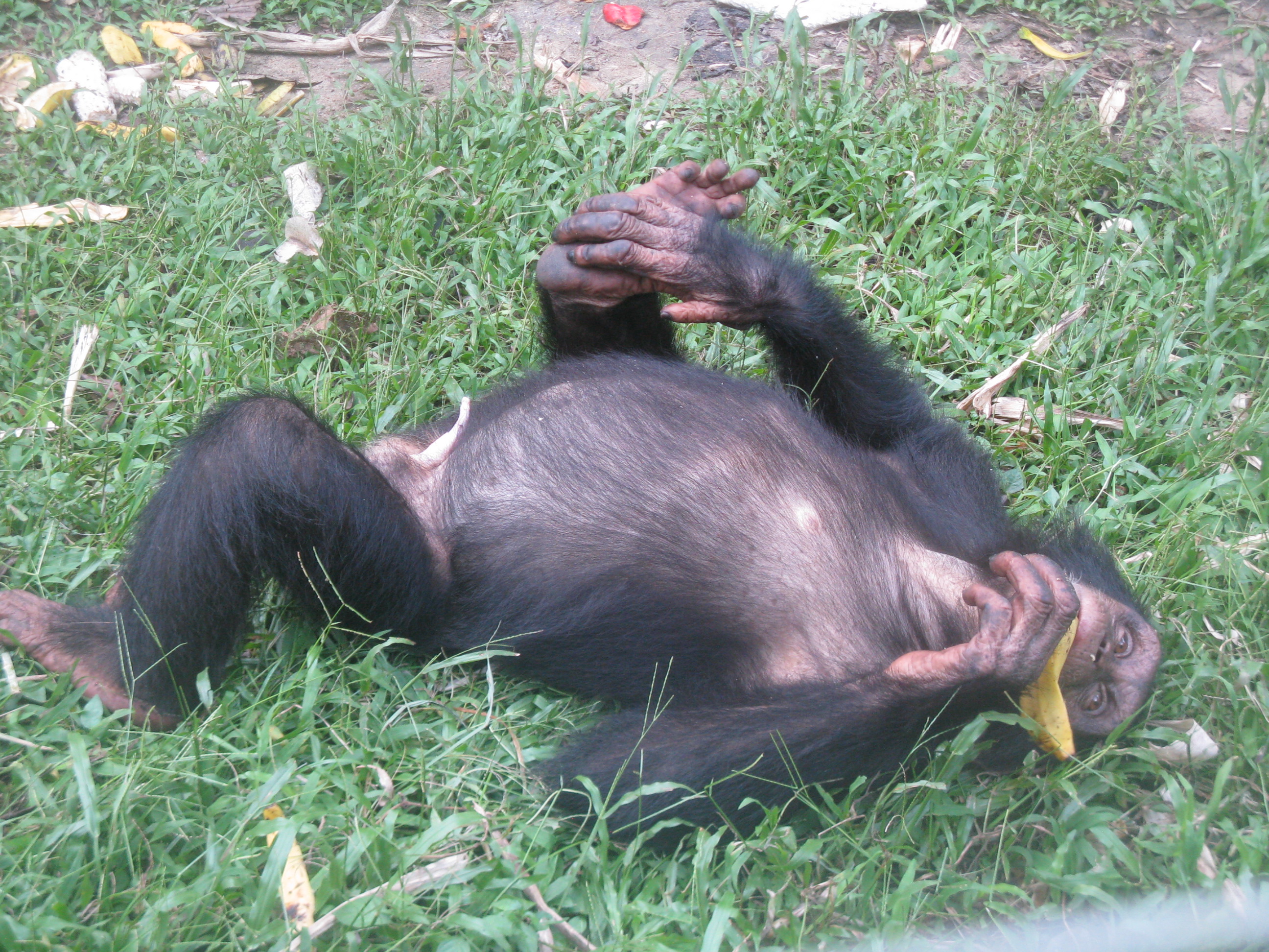 Bij de chimpansees waagde geen mens zich binnen. Toen de bananen over de omheining werden gegooid zag ik waarom: ze joegen elkaar op, krijsten alsof ze gevierendeeld werden en mepten met niet misselijke kracht een ander de struiken in. Het was een voortdurend vechten om de hiërarchie in de groep. Maar eenmaal voldoende bananen tot zijn beschikking hebbend vleide eenieder zich neer in het gras en begon smakkend en schetend de buit te verorberen.