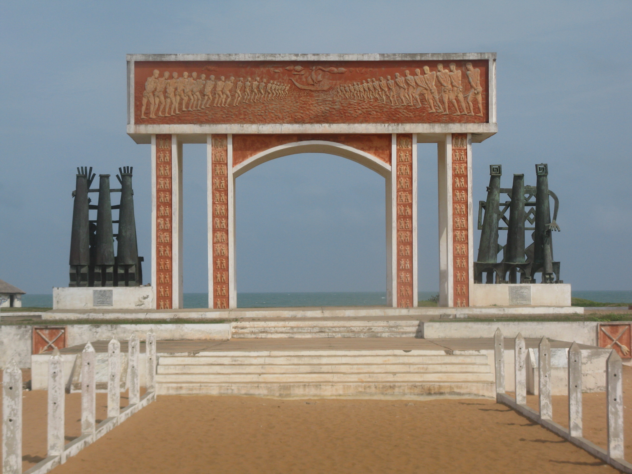 De route eindigt bij het slavenmonument in Ouidah, het Point of No Return, vanwaar de slaven uit het binnenland verscheept werden naar de suikerplantages aan de andere kant van de oceaan, of naar de Goudkust in Ghana. Ook zo’n mooie plek waar je niet aan afziet dat de grond gedrenkt is in bloed, zweet en tranen. Ik stapte er uit de auto en liep onder de stenen boog door, die geflankeerd wordt door sculpturen van geketende slaven. Ik probeerde mij voor te stellen hoe hier rijen mannen, vrouwen en kinderen richting zee sjokten, in veel gevallen hun dood tegemoet, vaak al op zee, in het stinkende ruim van een boot vol kotsende lotgenoten. Het was pijnlijk om te zien dat ook deze plek omringd werd door souvenirwinkeltjes en gidsen, vechtend om de aandacht van de spaarzame toerist.