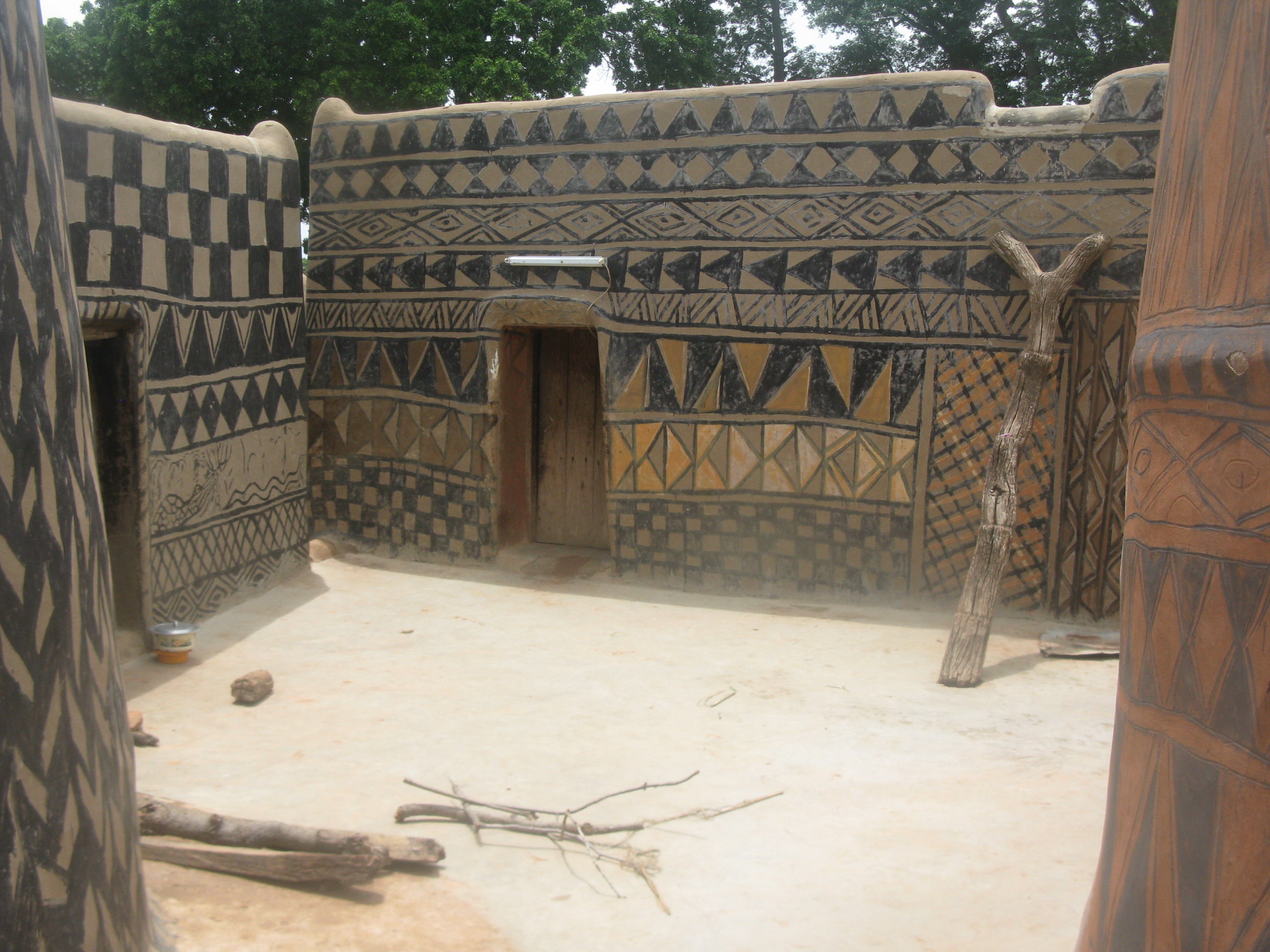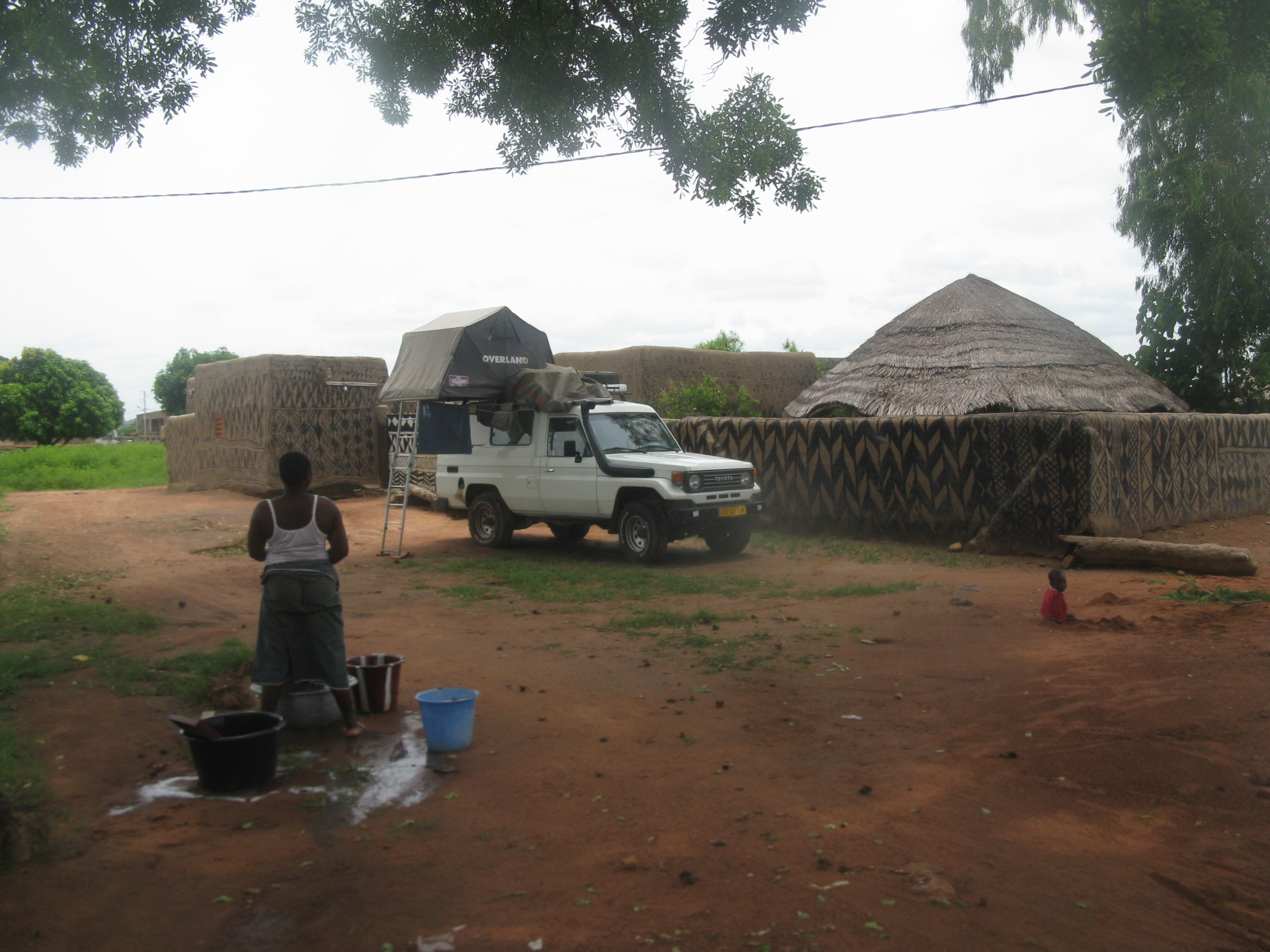 De volgende dag leidde Franc mij rond door de omgeving. We begonnen bij een traditionele familiewoning, gebouwd in dezelfde stijl als de auberge. Ook hier waren de muren beschilderd met geometrische patronen, in zwart en rood. Franc leidde me door de compound, legde de betekenis van alle symbolen uit en leidde me langs de verschillende huisjes. Iedereen in de familie had een eigen ruimte; vader en moeder, opa en oma, getrouwde kinderen met hun partner. Delen van de binnenplaats werden, door lage lemen muurtjes afgescheiden van het erf, ook gebruikt als stal, zodat de geiten, schapen, koeien, varkens en kippen ’s nachts veilig waren. Trapjes gemaakt van boomstammen leidden naar de daken, waar het graan gedroogd werd en je in het droge seizoen buiten onder de sterren kon slapen. Er heerste een rustige bedrijvigheid, waarbij kinderen ronddrentelden, vrouwen de was ophingen en mannen bij Franc kwamen informeren wie ik dan wel was. Ondertussen wist ik niet goed wat ik ervan moest denken. Het was duidelijk een traditioneel huis zoals ik wilde zien, maar het was ook gewoon waar de familie van Franc woonde en dus niet de, opnieuw volgens Lonely Planet, zo bijzondere Chief’s Compound waar Tiébélé beroemd om is. Van de andere kant: die Chief’s Compound was waarschijnlijk een soort museum, qua opzet en versiering vergelijkbaar met de plek waar ik was, met dat verschil dat ik hier het leven zag zoals zich dat daadwerkelijk in een dergelijke compound afspeelde. Dus misschien had ik juist een veel meer authentieke ervaring dan die waarnaar ik in eerste instantie op zoek was geweest. En ik vond het toch mooi om te zien? Nou dan!