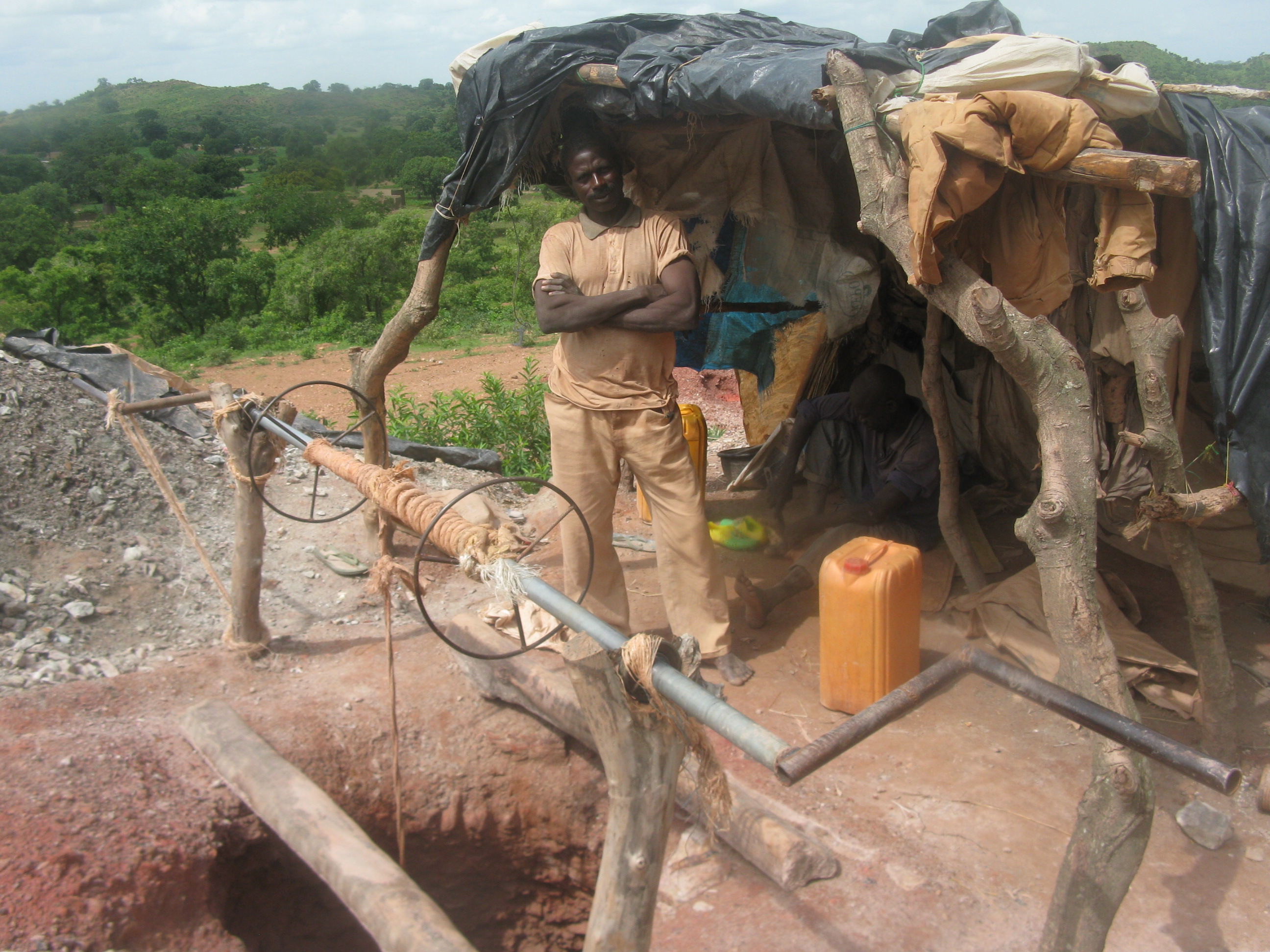 Na een bezoek aan een pottenbakster die routineus en ongeïnspireerd liet zien hoe je van klei een kom maakt, was onze volgende stop de plaatselijke goudmijn. Het was dat Franc zei dat we er waren, anders was ik er zonder argwaan aan voorbij gereden. Dat wat klaarblijkelijk de mijn was zag eruit als een willekeurig stuk niet-gecultiveerde savanne zoals ik voortdurend buiten de dorpen tegenkwam. Niet bijzonder, niet mooi, niet lelijk, gewoon land met wat begroeiing dat nergens voor gebruikt werd. Franc leidde me een heuvel op langs een aantal diepe gaten in de grond – mijnschachten die niet meer in gebruik waren. Een stukje verder stuitten we op drie jongens die bij een waterstroompje met een machine bezig waren grote stenen te verpulveren. Hoe dat precies goud moest opleveren was mij nog niet duidelijk. Verder op de heuvel kwamen we bij een hutje van boomstammen en zwart plastic. Twee mannen zaten uit te rusten bij een mijnschacht die wel in gebruik was. Tientallen meters daalden ze af in de heuvel, zonder ladder of touw, om daar de grond uit te graven waarin ze hoopten dat goud zat. De emmertjes rode aarde werden met een simpele takelconstructie naar boven gehaald. Hoe ze dan zelf vanuit de diepte weer omhoog kwamen, wilde ik weten.