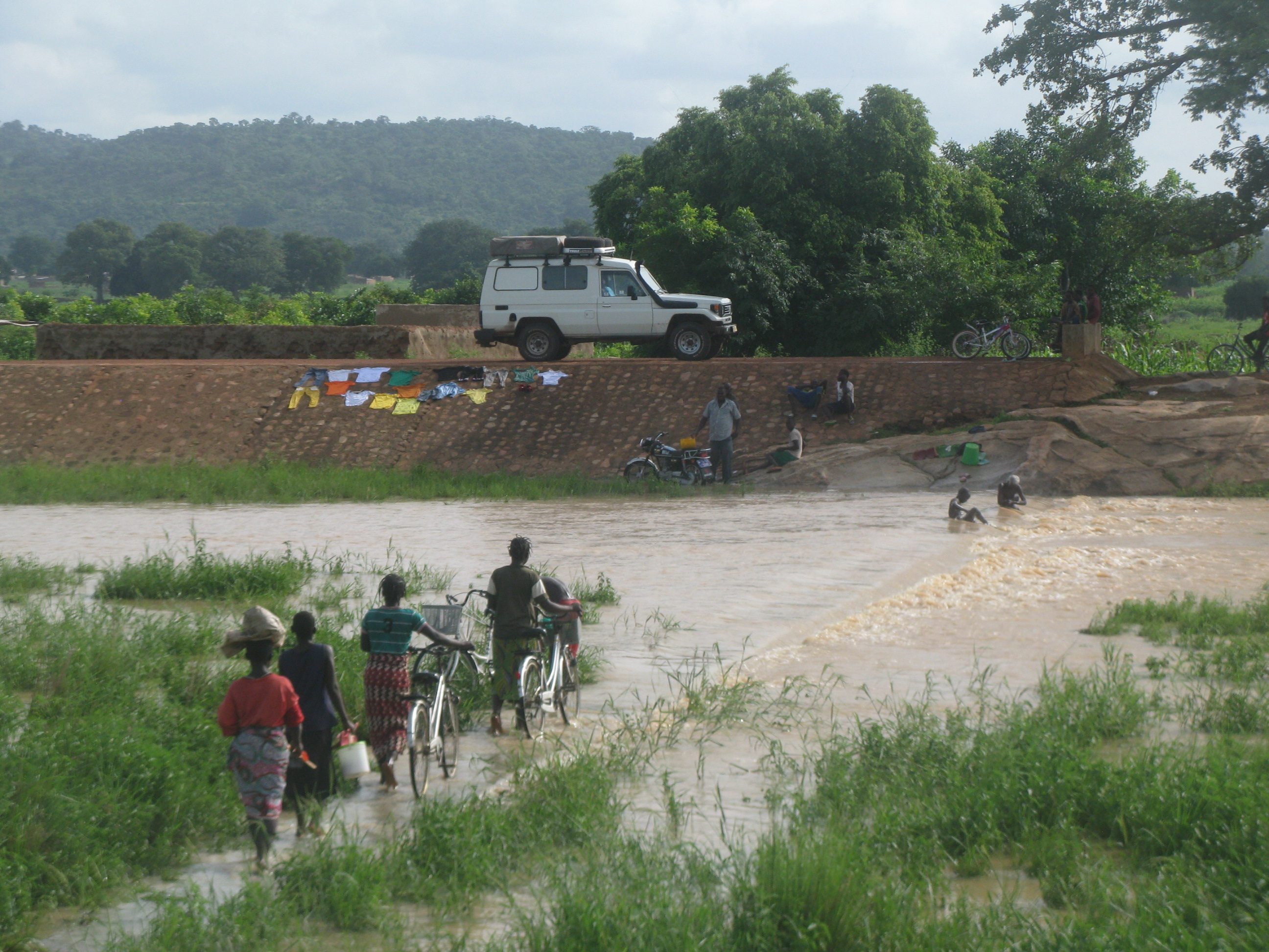 Ik was niet bang toen ik Burkina Faso in reed. Ik probeer als regel aan te houden om me niet druk te maken om problemen die er nog niet zijn. Bovendien waren er andere zaken die mijn aandacht vereisten, zoals het vinden van een bank om geld te pinnen, het zoeken naar de afslag richting Tiébélé en het ontwijken van ezelkarren. Het begon ook te regenen. Volgens de climate charts had Ghana een droge periode gedurende mijn tijd daar, en inderdaad was ik daar nauwelijks nat geregend. In Burkina Faso daarentegen zou ik in het regenseizoen terechtkomen. Ik had mij al eerder afgevraagd of regenwolken zich ook aan landsgrenzen houden en nu had ik mijn antwoord: ja. Terwijl het water met bakken uit de hemel kwam glibberde ik over de onverharde weg richting het dorpje dat bekend stond om zijn traditionele, versierde huizen. Niet ver van mijn bestemming werd er aan de weg gewerkt en mijn GPS gaf geen uitsluitsel over de precieze richting. Ik stopte en stapte uit om te vragen waar ik heen moest. De wegwerkers wezen op een brommertje dat aan kwam scheuren en voor mijn neus halt hield.